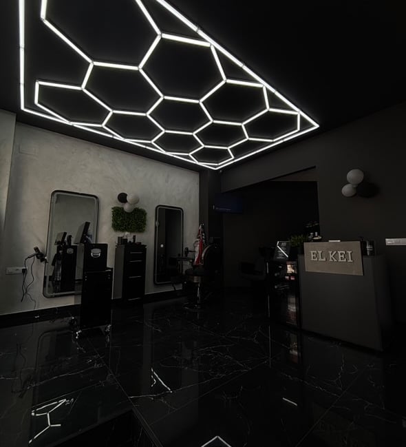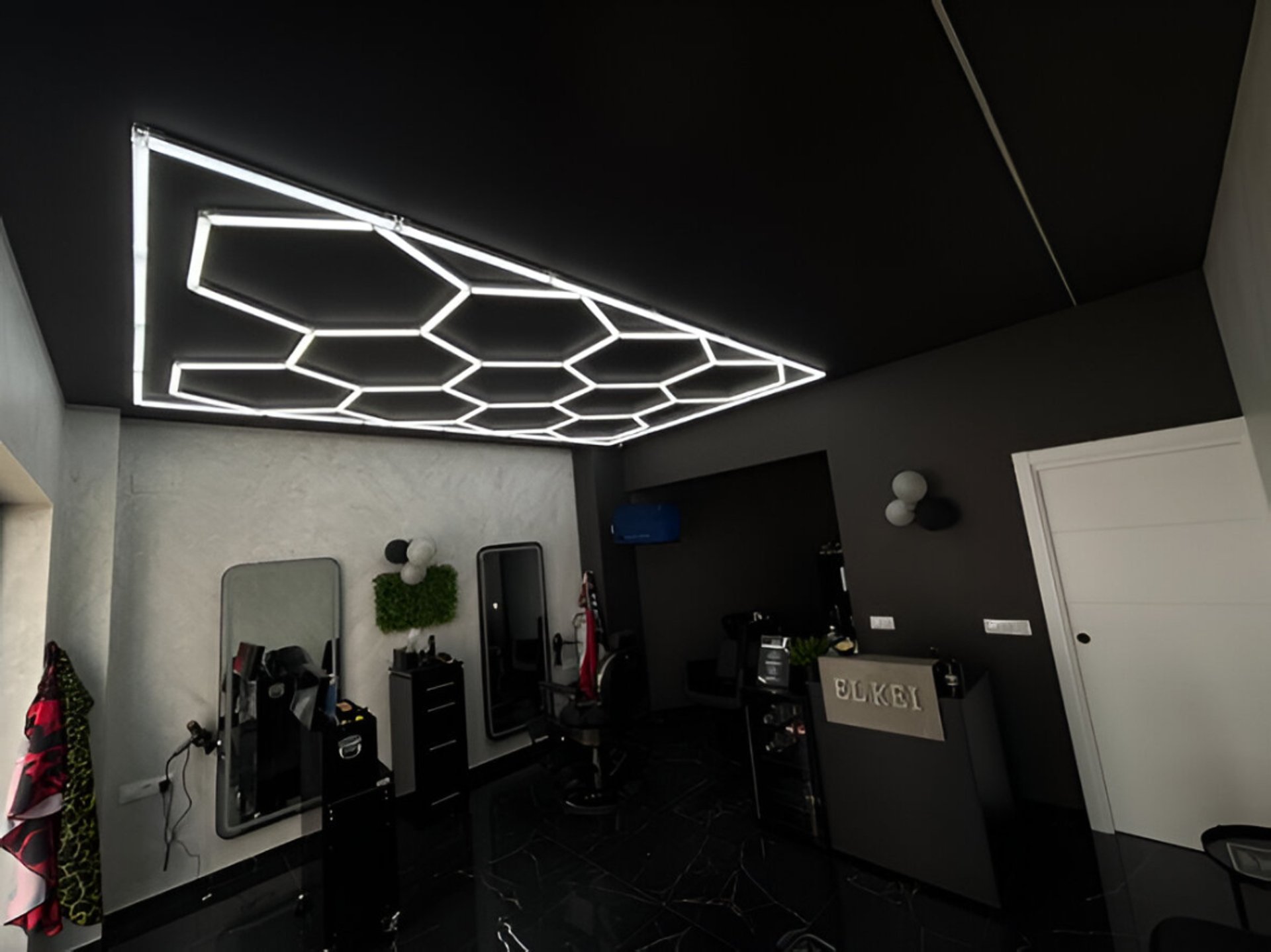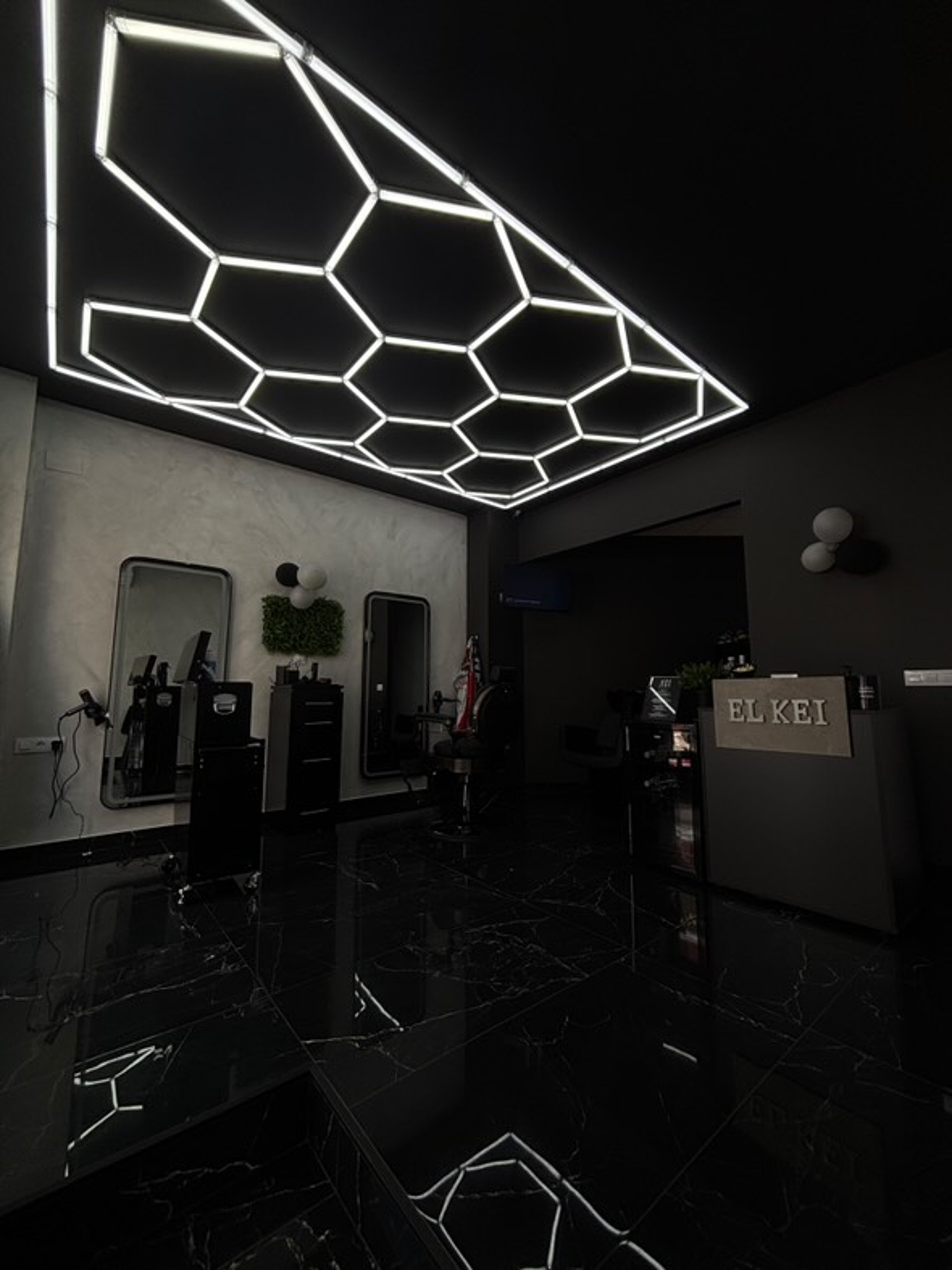 Se diseñó un sistema de iluminación a medida, adaptado a la distribución real del local y a las necesidades de trabajo propias de una barbería. Se priorizó la eliminación de sombras en las zonas de corte y una iluminación uniforme con un sistema de once hexágonos dispuestos en una colmena con tres filas rodeado por un perímetro. Una iluminación más que suficiente para un local de unos sesenta y cinco metros cuadrados que apenas dispone de una fuente de luz natural, permitiendo trabajar con precisión sin generar fatiga visual. La instalación se integró con el diseño del espacio, manteniendo una estética limpia y coherente.