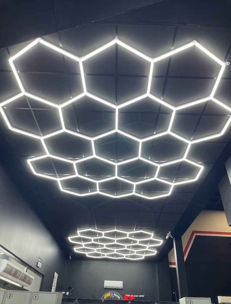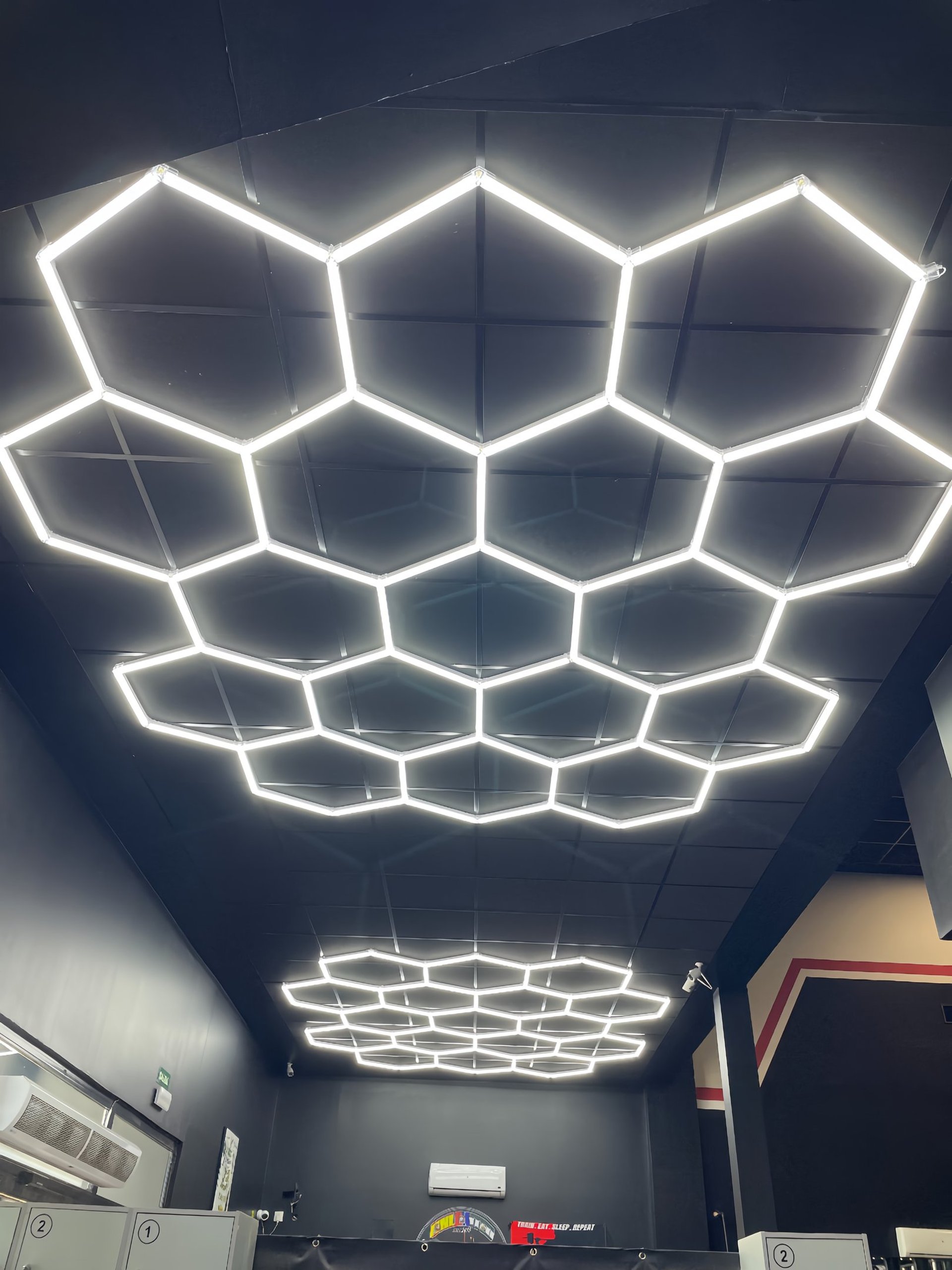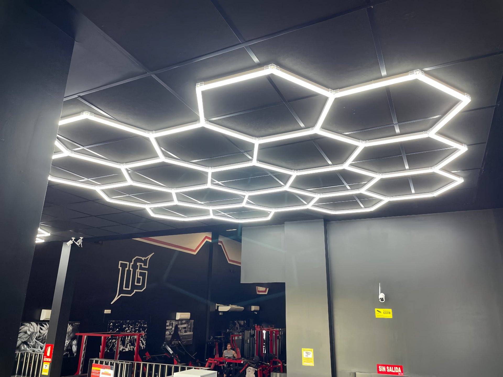 Se diseñó e instaló un sistema de iluminación a medida, en ambas zonas, instalamos una colmena de diecisiete hexágonos led dispuesta en cinco filas. Con una instalación totalmente simétrica . La iluminación se planteó para generar una primera impresión clara y profesional desde el acceso y en la sala de posing, donde producimos una iluminación vertical orientada a resaltar la definición corporal frente al espejo y mejorar la experiencia de uso del espacio.